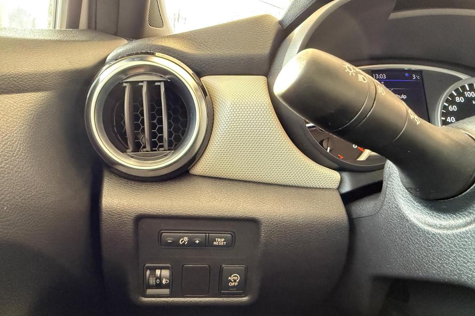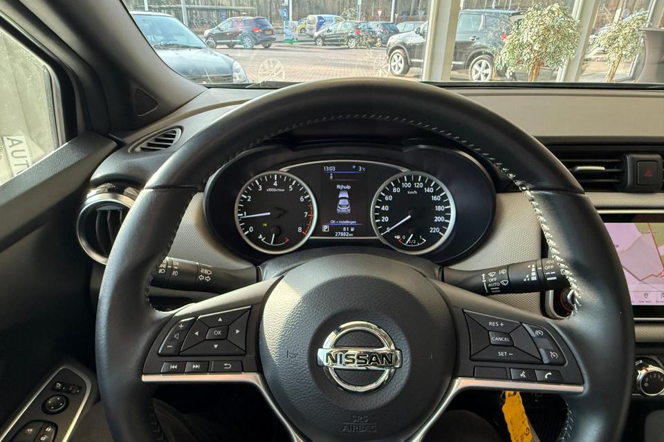 Bij het inparkeren hoeft u het laatste stukje niet te gokken: de achteruitrijcamera kijkt voor u uit. De bediening van het audiosysteem en het navigatiesysteem gebeurt met knoppen op het stuur. De audio is overigens voorzien van DAB-radio voor een altijd heldere ontvangst. Achter het stuur van deze Nissan bent u niet alleen. De auto kijkt als het ware met u mee tijdens de rit. De regensensor schakelt de ruitenwissers in als het nodig is en de automatisch inschakelbare verlichting doet de lichten voor u aan. De voordelen van de aanwezige cruise control hoeven we niet uit te leggen. Een mooie, constante snelheid - niet te snel, niet te langzaam. Precies goed. Met de ingebouwde airconditioning zit u altijd ontspannen achter het stuur. U bent in deze Nissan ook voorzien van automatisch dimmende binnenspiegel, lederen stuur, centrale deurvergrendeling met afstandsbediening en boordcomputer.